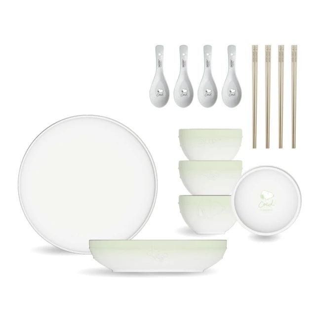 - Includes 4 bowls, 2 shallow plates, 4 spoons, and 4 pairs of chopsticks