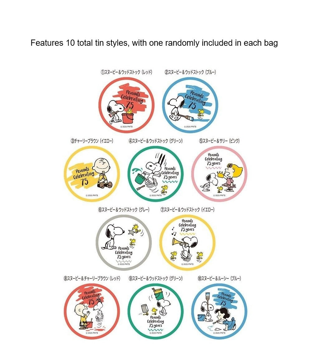 Enjoy a sweet surprise with this Peanuts Snoopy “75th Anniversary” Candy & Tin Set—three candy bags, each paired with a random anniversary tin from 10 different styles!