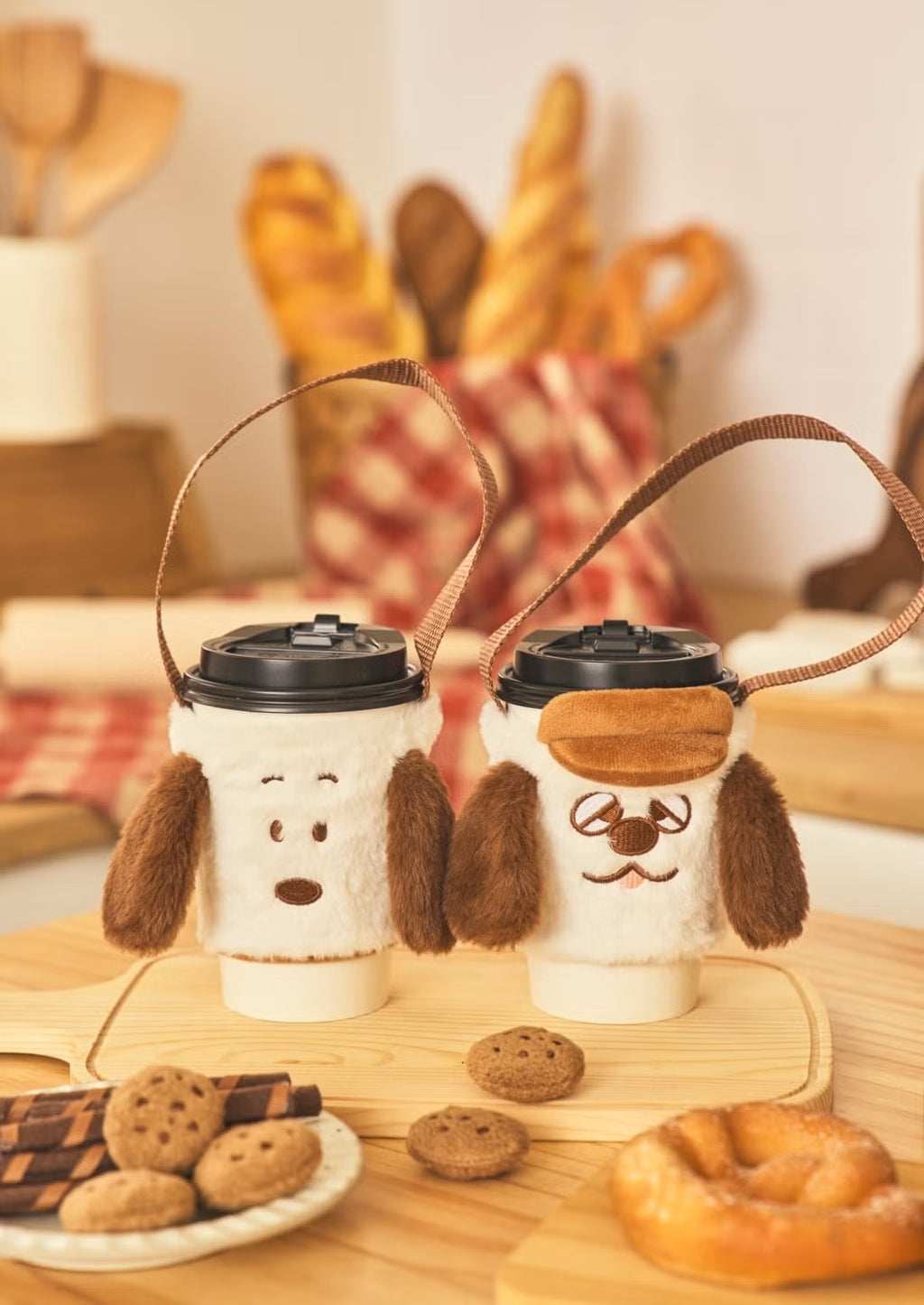 Carry your favorite drink in cozy style with this plush Snoopy & Olaf "Bakery Buddies" drink holders, featuring soft fuzzy details, floppy ears, and a handy strap for on-the-go sipping!