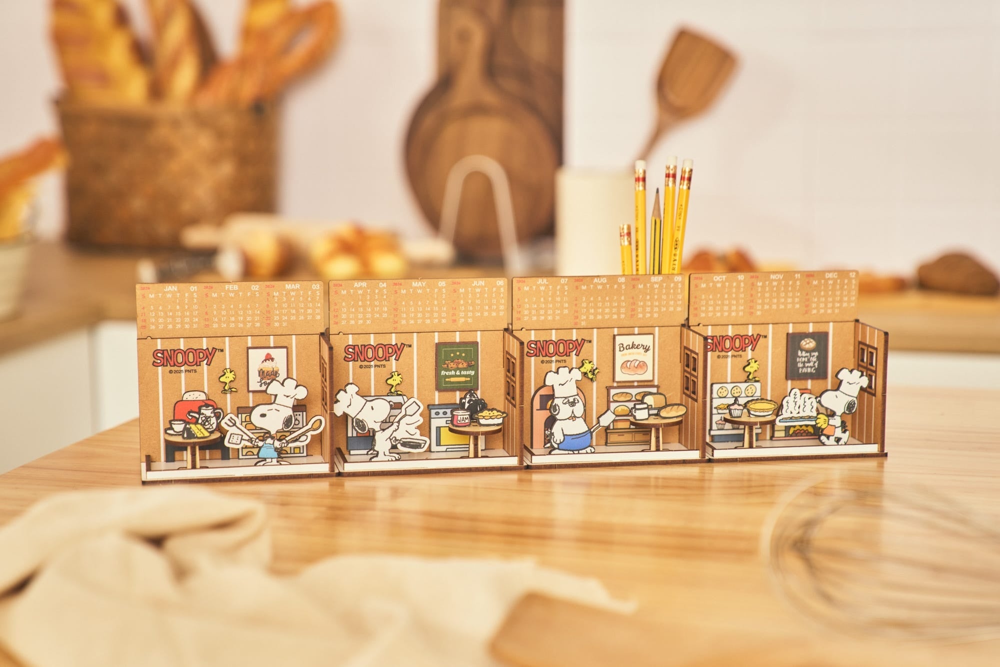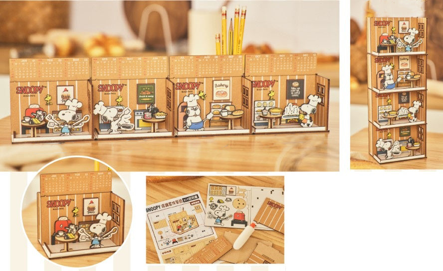 A charming desk set featuring four Snoopy pencil holders, each printed with the months and days of 2026, bringing both fun and function to your daily workspace!