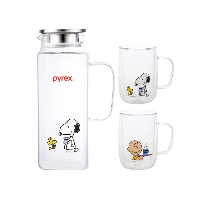 Serve up smiles with the Snapware x Peanuts Snoopy "Brunch Time" Pitcher Set, featuring 1 delightful pitcher and 2 matching mugs—perfect for sharing your favorite drinks with a side of Snoopy fun!